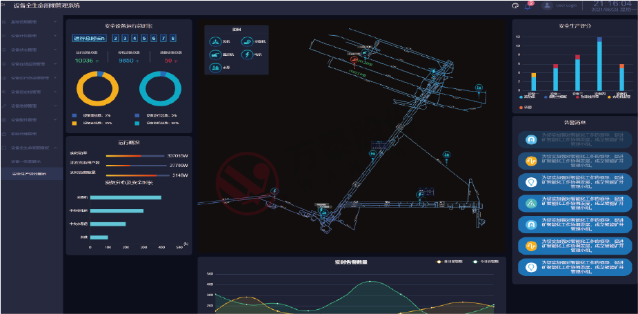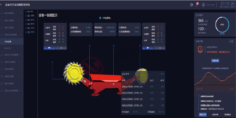系統(tǒng)以煤礦裝備智能化感知、大數(shù)據(jù)、物聯(lián)網等信息化技術為支撐,根據(jù)設備全生命周期和業(yè)務管理流程特點,實現(xiàn)設備的采購、出入庫、調撥、定巡檢、使用、狀態(tài)監(jiān)測、故障診斷、維護、大修改造,直至報廢的全生命周期跟蹤管理與服務,實現(xiàn)設備在一張圖上的位置服務、實時監(jiān)測和動態(tài)跟蹤,達到井下設備使用過程可管控、運行狀態(tài)透明化、維修服務主預防、質量問題可追溯的“技術一張圖,管理一張網,服務一條龍”的新型管理模式,推進煤礦設備管理與服務信息化。