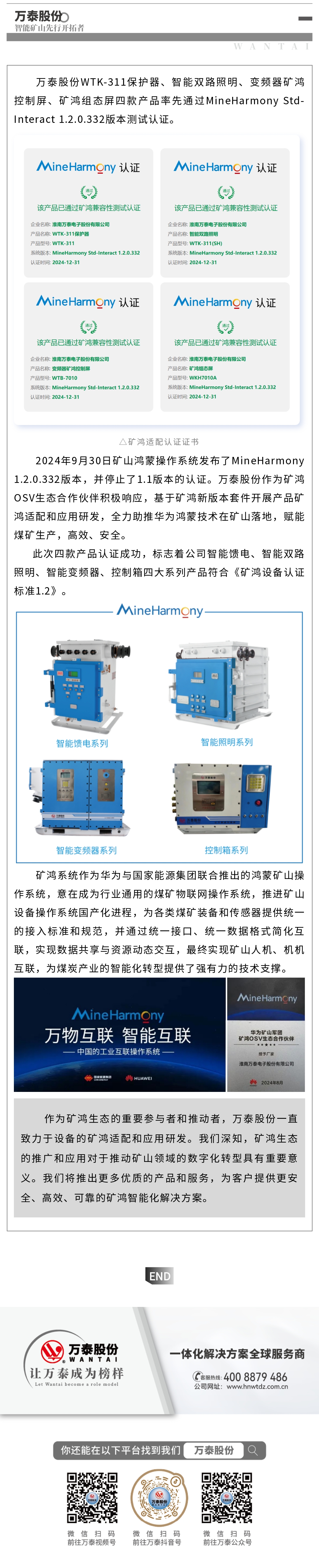 萬泰股份四款產(chǎn)品率先通過礦鴻1.2.0.332測試認證